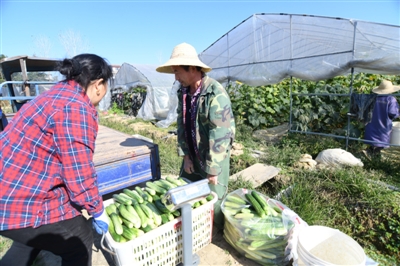 12日,咸安區(qū)綠佳綠色蔬菜專業(yè)合作社蔬菜基地,菜農(nóng)將新鮮采摘的黃瓜稱重運往市場。