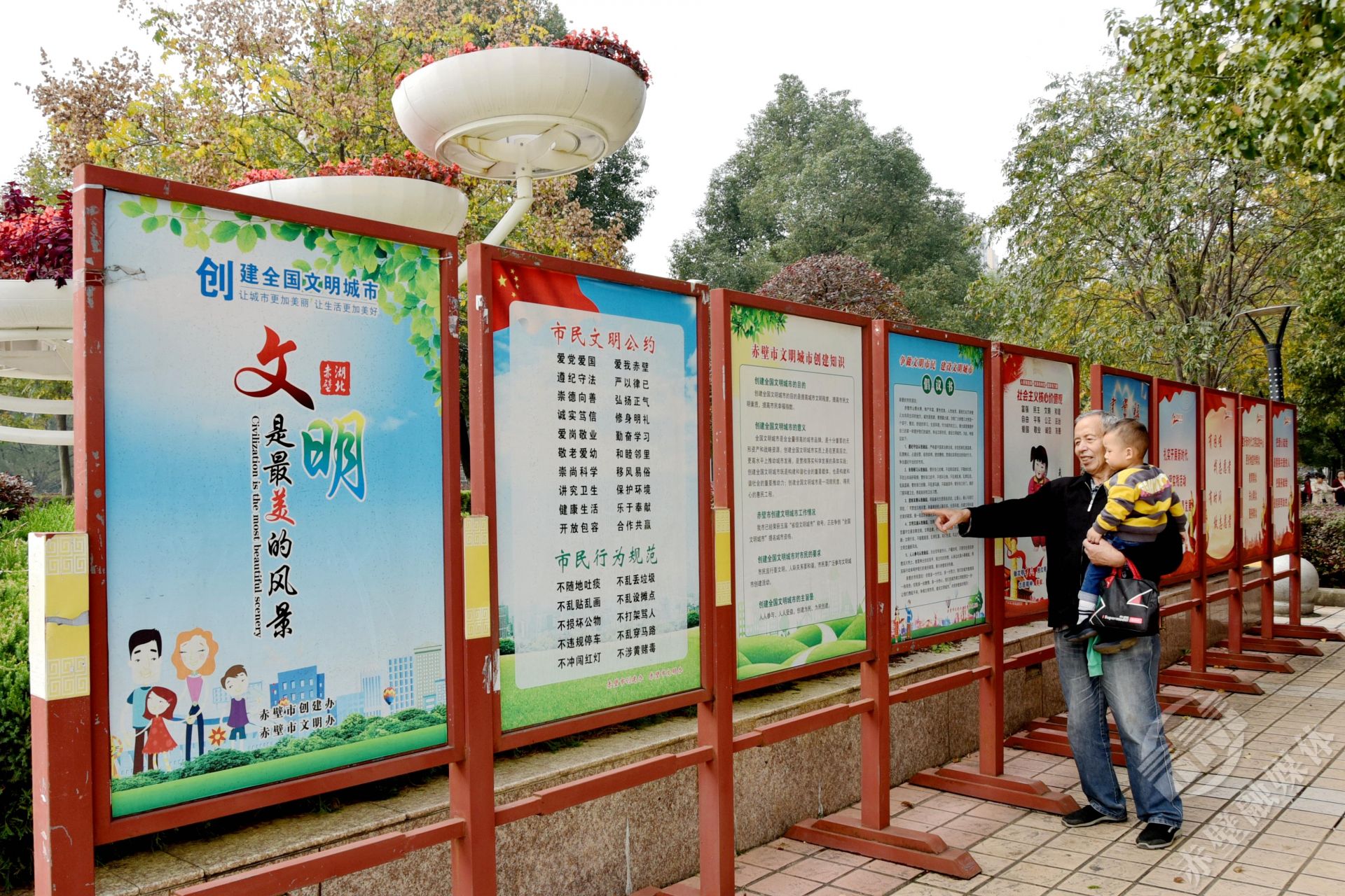 “今天帶孫子出來轉(zhuǎn)轉(zhuǎn),抬眼就看到這個(gè),正好教孫子認(rèn)認(rèn)字。”10月29日,溜彎在人民廣場(chǎng)的羅爺爺指著文明創(chuàng)建宣傳展板開心的對(duì)記者說。