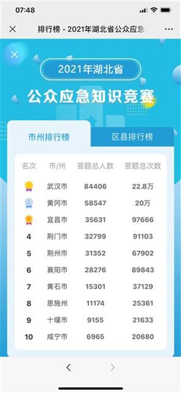 湖北省應急知識競賽答題活動于5月8日正式開賽,截至當日17時,參與人數(shù)突破23.3萬人,答題總次數(shù)超62萬次。