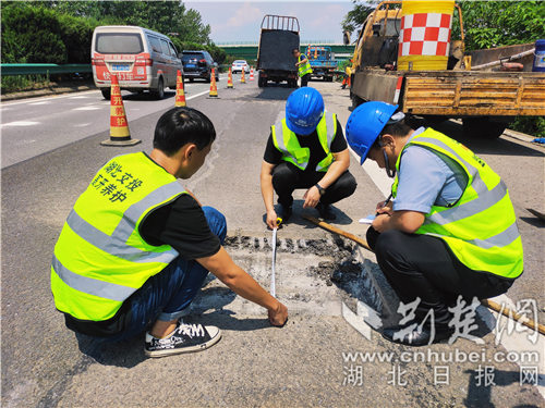 養(yǎng)護人在驕陽下測量路面坑槽。 通訊員 供圖