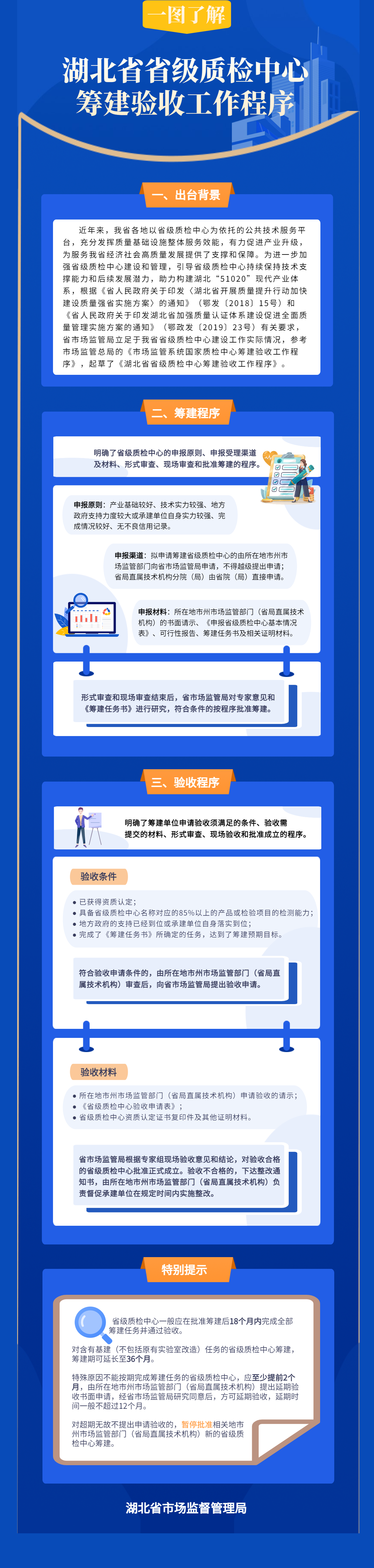 為進一步加強省級質檢中心建設和管理,引導省級質檢中心持續(xù)保持技術支撐能力和后續(xù)發(fā)展?jié)摿?,助力構建湖北?1020”現(xiàn)代產業(yè)體系,近日,湖北省市場監(jiān)管局立足于我省省級質檢中心建設工作實際情況,起草了《湖北省省級質檢中心籌建驗收工作程序》。