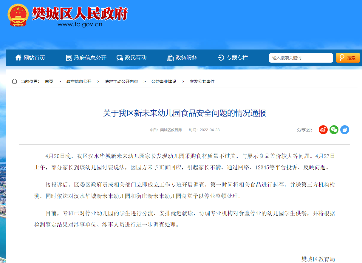 接投訴后,區(qū)委區(qū)政府責(zé)成相關(guān)部門立即成立工作專班開展調(diào)查,第一時間將相關(guān)食品進行封存,并送第三方機構(gòu)檢測,同時依法對漢水華城新未來幼兒園和衡莊新未來幼兒園食堂予以停業(yè)整頓處理。