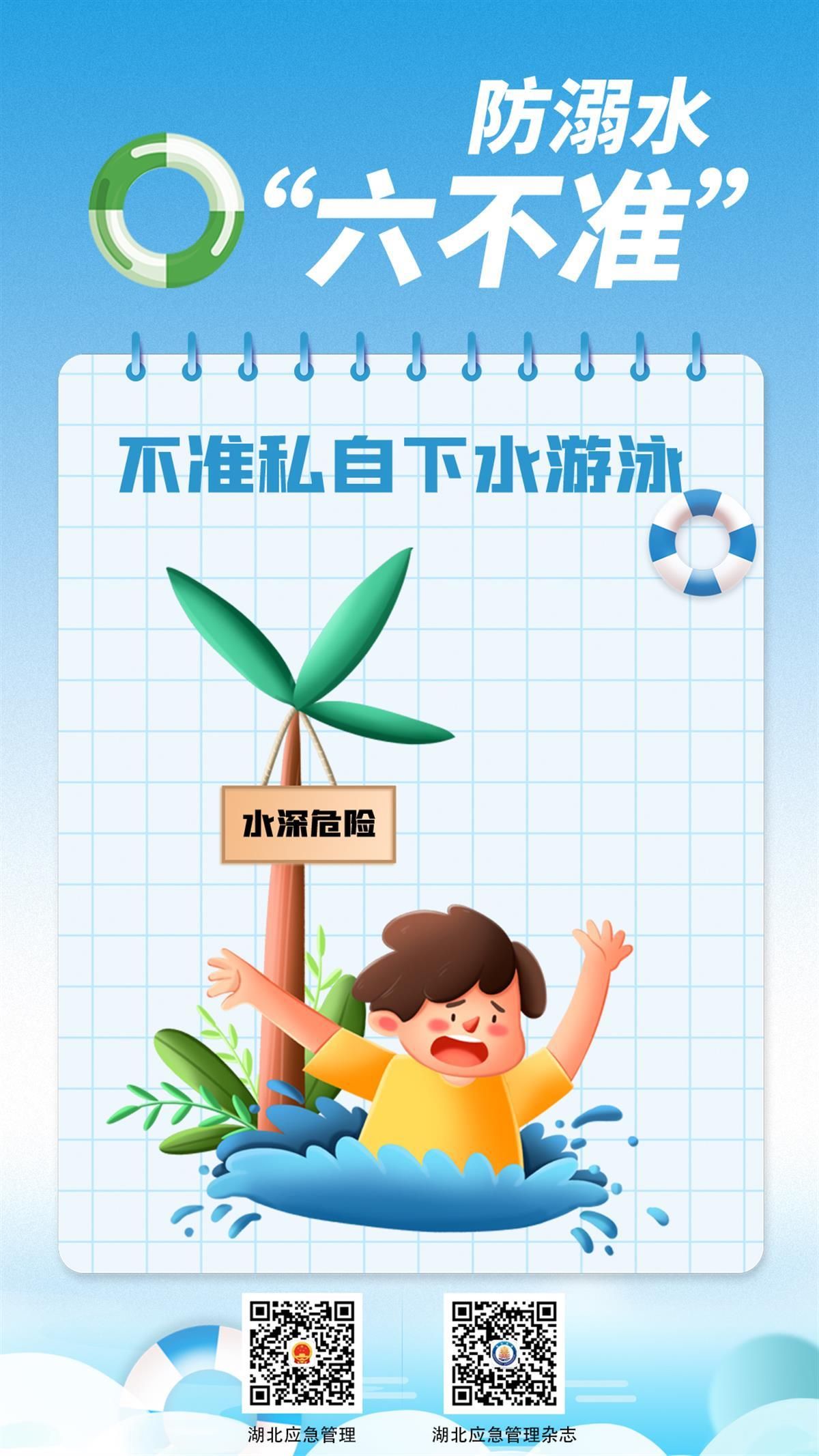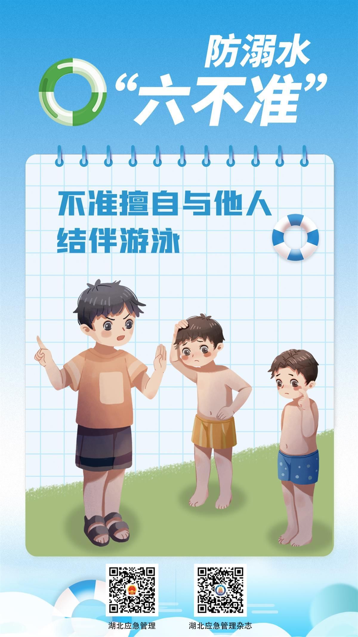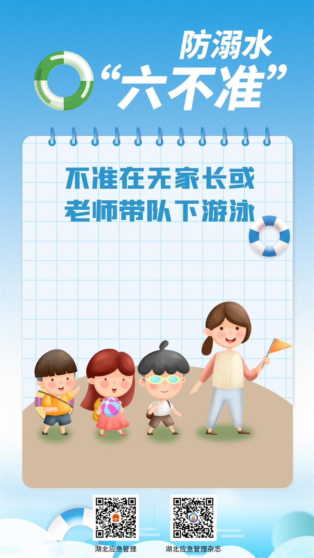 如何避免悲劇發(fā)生?7月8日,湖北省應急管理廳發(fā)布系列海報,提醒學生防溺水應做到“六不準”:不準私自下水游泳;不準擅自與他人結(jié)伴游泳;不準在無家長或教師帶領(lǐng)的情況下游泳;不準到無安全設施、無救援人員的水域游泳;不準到不熟悉的水域游泳;不準未成年人擅自下水施救。