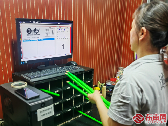 在漢旗樂器的音高配對(duì)室里,只見技術(shù)工人從一大堆同級(jí)的鼓棒中,每次拿出10根對(duì)著辨音器進(jìn)行敲打,設(shè)備馬上進(jìn)行音質(zhì)分析、配對(duì),并迅速在電腦顯示屏上顯示出配對(duì)結(jié)果。