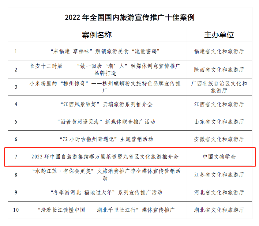 由萬里茶道聯(lián)合申遺辦策劃,萬里茶道沿線九省(區(qū))文化和旅游廳(文物局)主辦,萬里茶道聯(lián)合申遺辦、中國文物交流中心、中國文物學(xué)會文物旅游專業(yè)委員會、中國古跡遺址保護協(xié)會文化線路專業(yè)委員會共同支持,湖北省文物事業(yè)發(fā)展中心、環(huán)中國自駕游集結(jié)賽組委會、北京江湖國際旅游有限公司聯(lián)合承辦,中國文物學(xué)會報送的“2022’萬里茶道——環(huán)中國自駕游集結(jié)賽暨九省區(qū)文化旅游推介會”獲評十佳案例(第七名)。