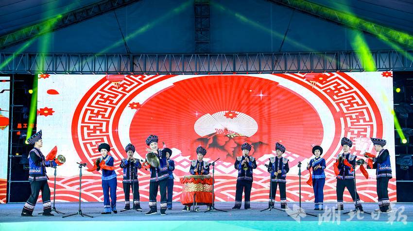 由龍趕湖燈戲文化藝術學校表演的吹打樂《龍王鬧親》由恩施燈戲傳承人改編而成,曲目歡快、催人奮進,深受廣大觀眾的喜愛,表達了有朋自遠方來,淳樸好客的恩施土家人用歡快又熱情的音樂和號子的形式歡迎遠道而來的客人,充分展現(xiàn)恩施土家人的豁達和熱情。