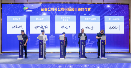 活動(dòng)現(xiàn)場(chǎng),民生證券、九州證券、第一創(chuàng)業(yè)證券、國(guó)泰君安證券4家證券公司與東湖高新區(qū)金融局簽署分公司招商協(xié)議,據(jù)悉,民生證券武漢分公司已正式落戶光谷,成為東湖高新區(qū)第一家證券公司省級(jí)分公司。
