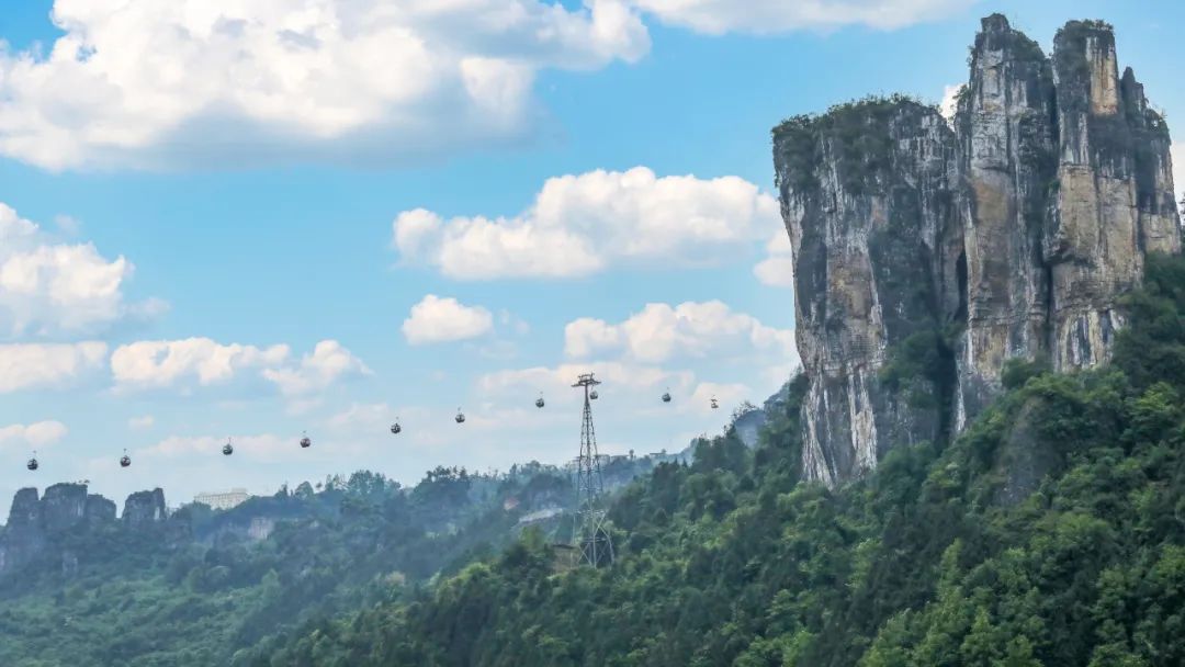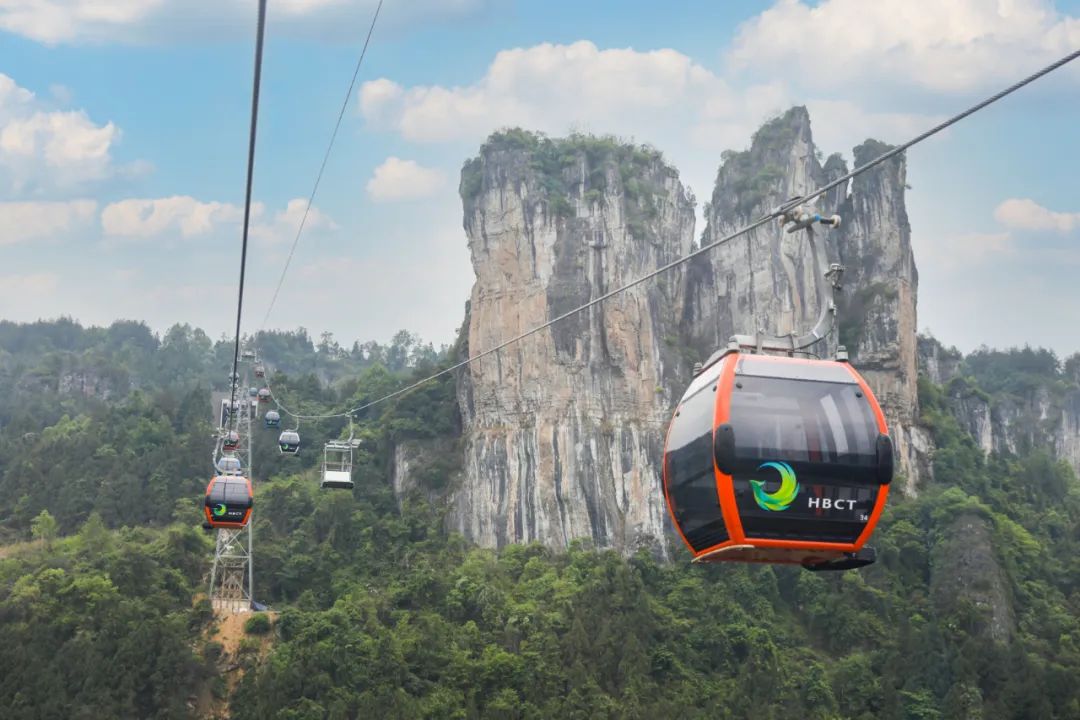 景區(qū)跨清江索道全長1056米,采用了國際上先進的單線循環(huán)脫掛式八人吊廂,上下高差156米,運行速度最快6米/秒,設計運載量每小時2700人。乘坐時既可以仰望紅花峰林,也可俯瞰清江河谷秀美風光。