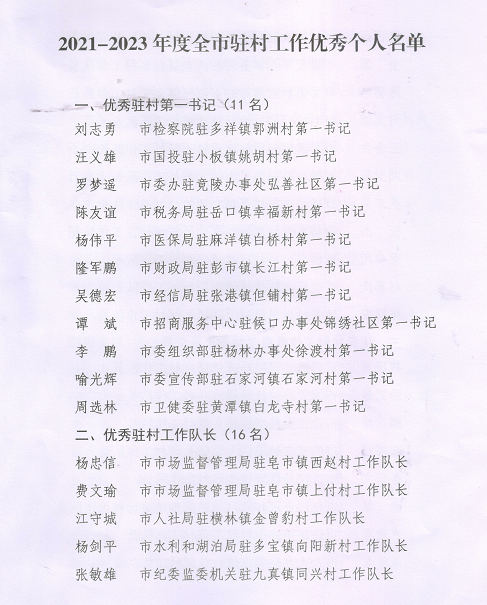 據(jù)悉,為表揚(yáng)先進(jìn)、弘揚(yáng)正氣,激勵(lì)廣大駐村第一書記、駐村工作隊(duì)長(zhǎng)和工作隊(duì)員在鄉(xiāng)村振興一線奮勇爭(zhēng)先、建功立業(yè),奮力開創(chuàng)天門市駐村幫扶工作新局面,天門市委組織部、市鄉(xiāng)村振興局聯(lián)合開展2021-2023年度駐村工作優(yōu)秀個(gè)人評(píng)選工作。經(jīng)市級(jí)統(tǒng)一考核、鄉(xiāng)鎮(zhèn)民主推薦、市級(jí)嚴(yán)格評(píng)審,劉志勇等11名駐村第一書記、楊忠信等16名工作隊(duì)長(zhǎng)、魏慶軍等28名駐村工作隊(duì)員被評(píng)為“2021-2023年度駐村工作優(yōu)秀個(gè)人”。
