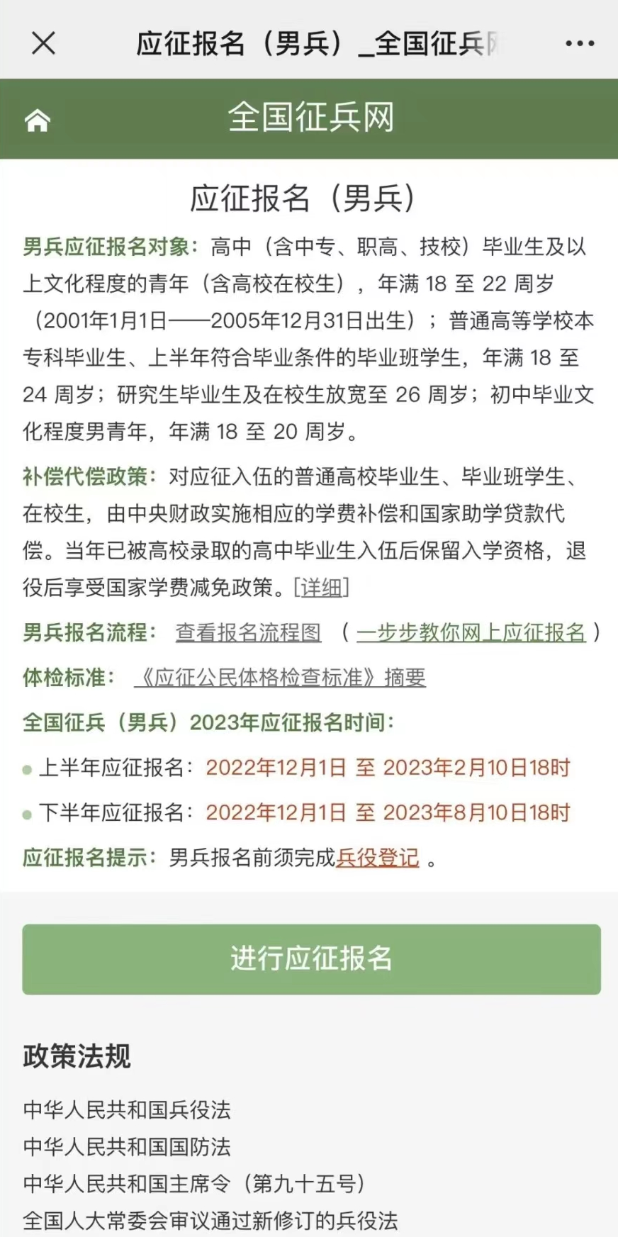 高中(含中專、職高、技校)畢業(yè)生及以上文化程度的青年(含高校在校生),年滿18至22周歲;全日制普通高等學(xué)校本??飘厴I(yè)生,年滿18至24周歲;研究生畢業(yè)生及在校生放寬至26周歲;初中畢業(yè)文化程度男青年,年滿18至20周歲。