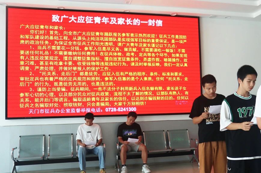 走進(jìn)體檢大廳,一封致應(yīng)征青年及家長(zhǎng)的廉潔征兵公開信,在LED大屏幕上醒目顯示。此前,天門市人武部也通過媒體平臺(tái),廣泛宣傳廉潔征兵政策規(guī)定,為做到重點(diǎn)人群應(yīng)知盡知、全員覆蓋,天門市人武部將公開信寫在了征兵體檢現(xiàn)場(chǎng),以更醒目的方式提示應(yīng)征青年及家長(zhǎng)嚴(yán)防征兵詐騙,嚴(yán)守征兵紀(jì)律。