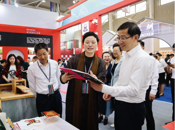 文化和旅游部黨組成員、副部長饒權,新疆維吾爾自治區(qū)黨委黨的建設工作領導小組副組長田文等領導參觀了湖北展區(qū),并與傳承人進行親切交流,了解傳承發(fā)展情況。
