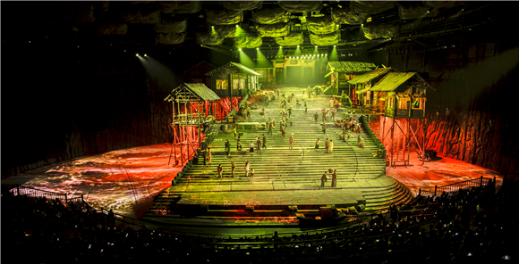 該劇用大膽、創(chuàng)新的藝術(shù)手法,讓更多的觀眾能夠沉浸在劇中,與英雄“對話”。據(jù)介紹,磁器口碼頭的舞臺搭建是用磚石砌成72個(gè)臺階,用約2000根柱子搭建起18米高的世界最大室內(nèi)吊腳樓建筑群,用160個(gè)獨(dú)立頂部懸吊電機(jī)組成燈光舞美裝置,用超20臺空中旋轉(zhuǎn)升降的燈光車來完成的……縱深的空間感,逼真的場景,完美再現(xiàn)40年代重慶城市風(fēng)貌。演藝空間與觀演空間交相穿插。觀眾與演出融為一體,經(jīng)歷一場身臨其境的獨(dú)特觀演體驗(yàn)。