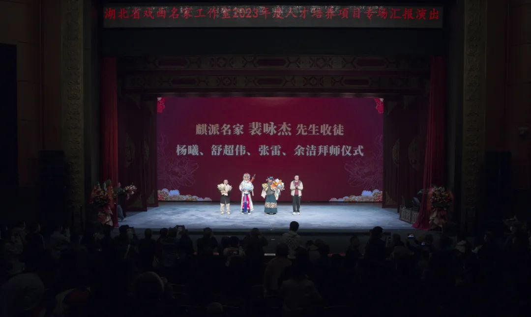 11月19日下午,京劇麒派名家裴詠杰收徒,優(yōu)秀青年京劇演員楊曦、舒超偉、楚劇演員張雷、晉劇演員余潔拜師儀式在省京劇院京韻大舞臺(tái)隆重舉行。省文化和旅游廳二級(jí)巡視員管成文出席并講話,來自社會(huì)各界的嘉賓和戲迷觀眾共同見證了這一盛況。儀式結(jié)束后,舉行了湖北省戲曲名家工作室2023年度人才培養(yǎng)項(xiàng)目匯報(bào)演出,楊曦、舒超偉、張雷和特邀嘉賓、天津京劇院一級(jí)演員王志鋼聯(lián)袂演繹了麒派名劇《蕭何月下追韓信》。