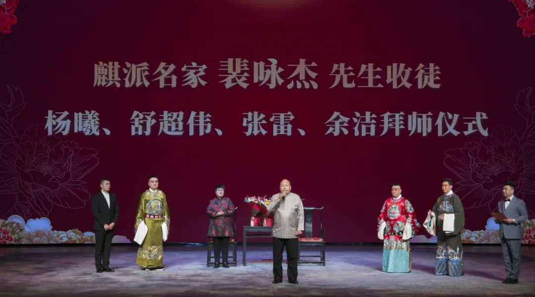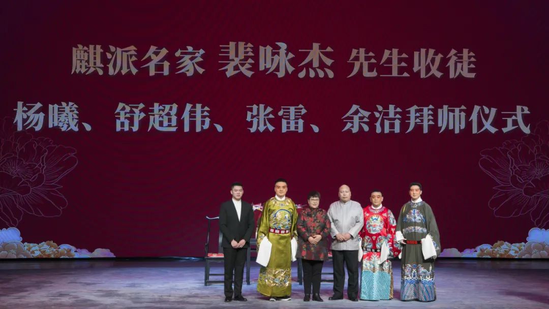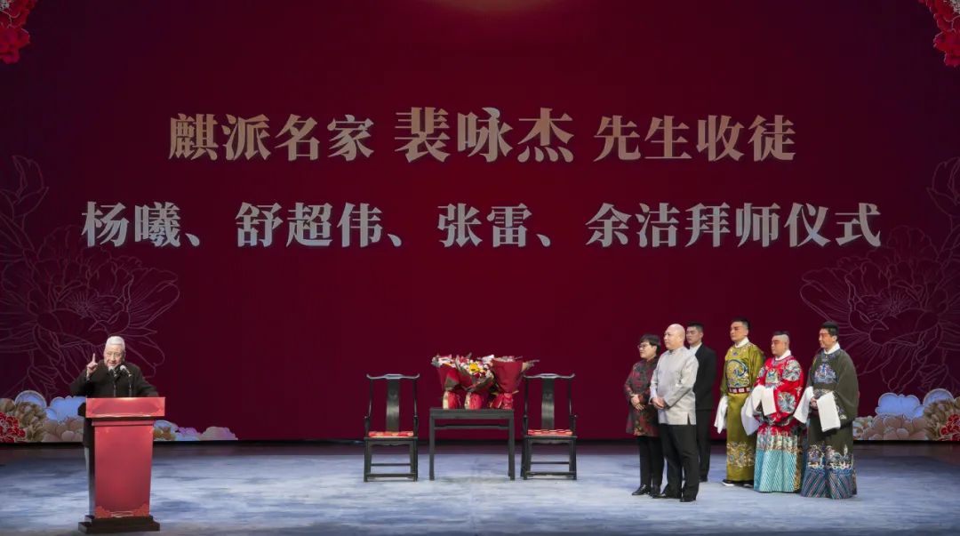 拜師儀式上,四名學(xué)生行跪拜禮,正式拜在裴詠杰先生門下,成為“麒派”第四代弟子。裴詠杰在發(fā)言中表示,“麒派”藝術(shù)是京劇流派中的瑰寶,前輩藝術(shù)家如高百歲、陳鶴峰等讓“麒派”藝術(shù)在湖北這片土地上綻放出奪目光彩,作為“麒派”演員,有責(zé)任、有義務(wù)幫助一些有條件、有追求的年輕演員們傳承這門藝術(shù)。要像自己恩師一樣,把畢生所學(xué)傾囊相授,師徒并進(jìn),不辱使命,把“麒派”藝術(shù)傳承下去并努力使之發(fā)揚(yáng)光大。省京劇院優(yōu)秀青年演員楊曦代表學(xué)生發(fā)言,感謝師父和師娘對(duì)他們師兄弟四人的諄諄教誨和關(guān)懷,今后將更加努力學(xué)習(xí)好傳承好“麒派”藝術(shù)精髓。
