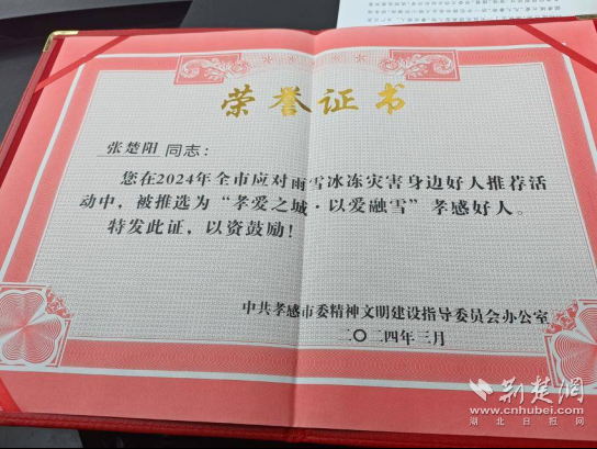 3月1日,孝南區(qū)毛陳鎮(zhèn)龍湖村“00后”大學生張楚陽因雪中義舉,被授予“孝愛之城·以愛融雪”孝感好人稱號,并現(xiàn)場接受了孝感市政府市長吳慶華的頒獎。