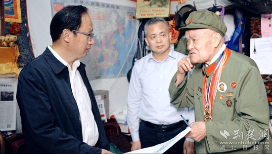 當(dāng)天上午,黃石市委宣傳部副部長、市委網(wǎng)信辦主任萬金光,黃石市退役軍人事務(wù)局黨組書記、局長陳鵬圖一行參加啟動(dòng)儀式,并前往抗美援朝老戰(zhàn)士瞿介昌住處看望。他們向瞿介昌老戰(zhàn)士簡單介紹了本次主題報(bào)道情況,向這位老英雄獻(xiàn)上了鮮花,表達(dá)了對(duì)退役軍人的敬意,并為“致敬英雄”采訪團(tuán)授旗。