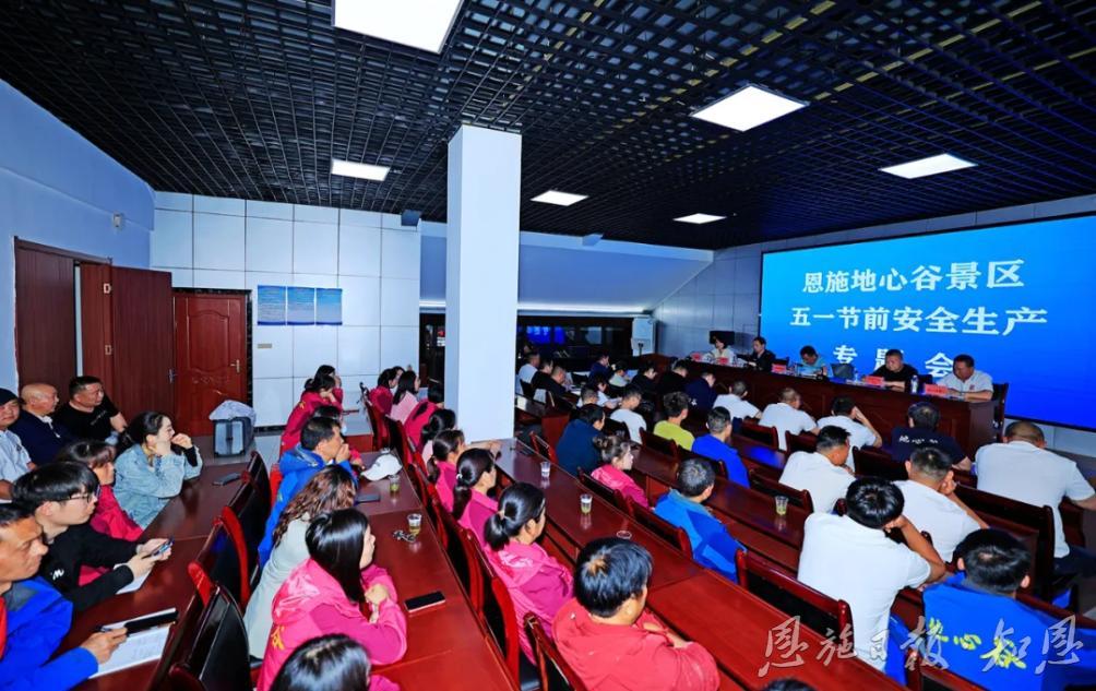 為確保“五一”假期景區(qū)各項(xiàng)工作的安全有序開展,4月18日,恩施地心谷景區(qū)召開了由高坪鎮(zhèn)政府主持,高坪鎮(zhèn)安全生產(chǎn)中心、文體廣電中心、食監(jiān)所、衛(wèi)生院、派出所、國土所、水利水產(chǎn)中心等單位負(fù)責(zé)人及景區(qū)全體員工參加的“五一節(jié)前安全生產(chǎn)專項(xiàng)會(huì)”。