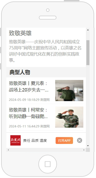 為向歷史開掘精神資源,營造崇尚英雄、學習英雄、關(guān)愛英雄的濃厚氛圍,黃石市委網(wǎng)信辦、市退役軍人事務局聯(lián)合荊楚網(wǎng)(湖北日報網(wǎng))啟動《致敬英雄》大型網(wǎng)絡專題宣傳。