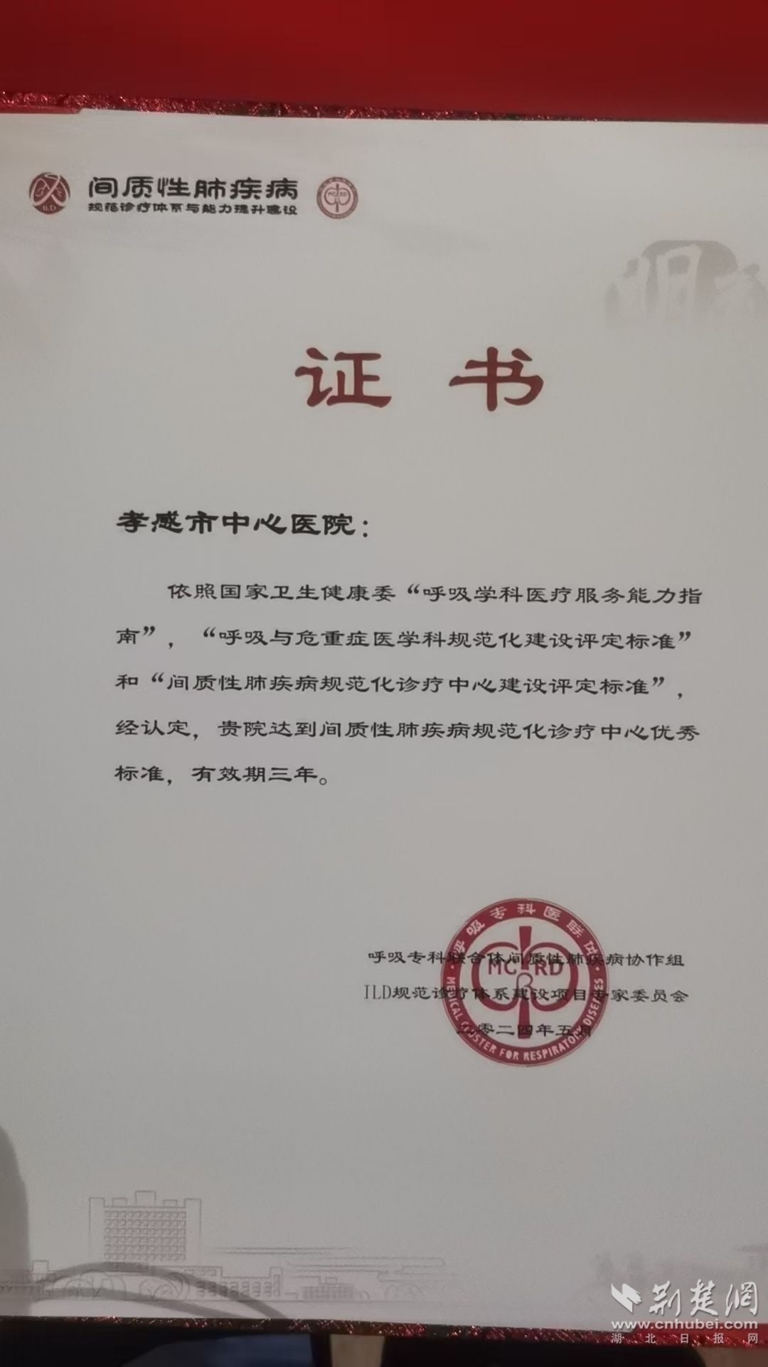 荊楚網(wǎng)(湖北日?qǐng)?bào)網(wǎng))訊(通訊員管菊艷 劉桂霞)5月25日,中國(guó)間質(zhì)性肺疾?。↖LD)規(guī)范診療中心認(rèn)定授牌大會(huì)在北京國(guó)家呼吸醫(yī)學(xué)中心舉行,孝感市中心醫(yī)院獲評(píng)全國(guó)“間質(zhì)性肺疾病規(guī)范診療中心建設(shè)”優(yōu)秀單位。