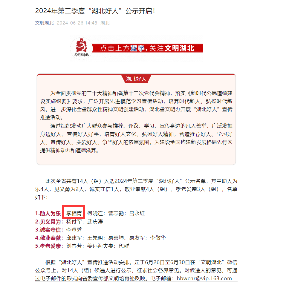 荊楚網(wǎng)(湖北日?qǐng)?bào)網(wǎng))訊(記者呂鑒蕾 通訊員華文莉)6月26日,2024年第二季度“湖北好人”名單集中公示,全省共有14人(組)上榜。其中,黃石開發(fā)區(qū)·鐵山區(qū)汪仁鎮(zhèn)磊山村村民李相育榜上有名。