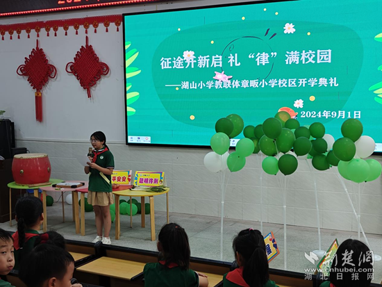 湖山小學(xué)教聯(lián)體章畈小學(xué)校區(qū),師生們齊聚學(xué)校報(bào)告廳,舉行“征途開(kāi)新啟,禮“律”滿校園”為主題的開(kāi)學(xué)典禮。