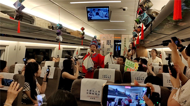 青年主播們在杭溫高鐵上欣賞黃梅戲表演。中國傳媒大學供圖