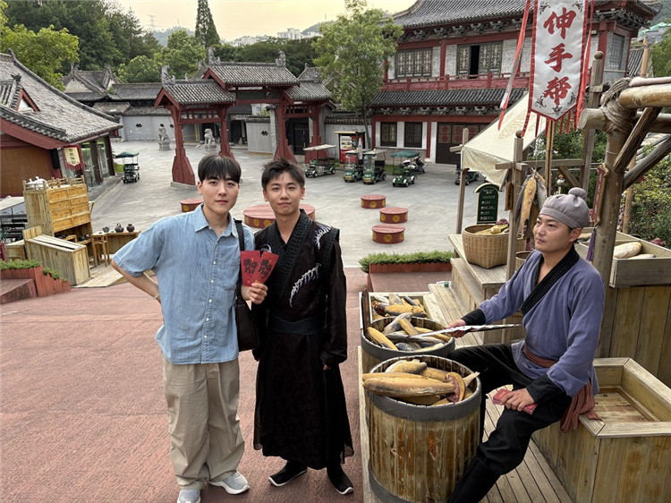 夜幕降臨,橫店影視城 “清明上河圖” 沉浸式夜游場景中,打鐵花的璀璨金焰與火壺表演的熾熱流光交織成震撼視覺盛宴。主播們的鏡頭精準捕捉下,這充滿東方美學的精彩瞬間被傳遞給屏幕前的萬千觀眾。來自韓國的主播,同時也是今年“漢語橋”韓國賽區(qū)冠軍的鄭茶云感慨道,此前他從未聽說過橫店,而實地走進 “清明上河圖” 場景后讓他直呼 “真香”。這里不僅還原了古畫中繁華熱鬧的煙火氣,與扮演商販的演員討價還價時,更讓他沉浸式感受到了北宋的人文風貌。