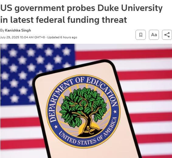 中新網(wǎng)7月29日電 據(jù)美國(guó)有線電視新聞網(wǎng)(CNN)及路透社報(bào)道,當(dāng)?shù)貢r(shí)間28日,美國(guó)特朗普政府表示,對(duì)美國(guó)杜克大學(xué)及《杜克法律雜志》展開調(diào)查,指控其存在偏向少數(shù)族裔群體的優(yōu)待行為,杜克大學(xué)由此成為最新一所可能被削減聯(lián)邦資金的美國(guó)高校。
