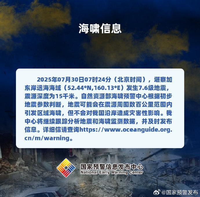 央視網(wǎng)消息:國家海洋預(yù)報臺發(fā)布地震海嘯信息,07月30日07時24分(北京時間),堪察加東岸遠海海域(52.44°N,160.13°E)發(fā)生7.6級地震,震源深度為15千米。自然資源部海嘯預(yù)警中心根據(jù)初步地震參數(shù)判斷,地震可能會在震源周圍數(shù)百公里范圍內(nèi)引發(fā)區(qū)域海嘯,但不會對我國沿岸造成災(zāi)害性影響。