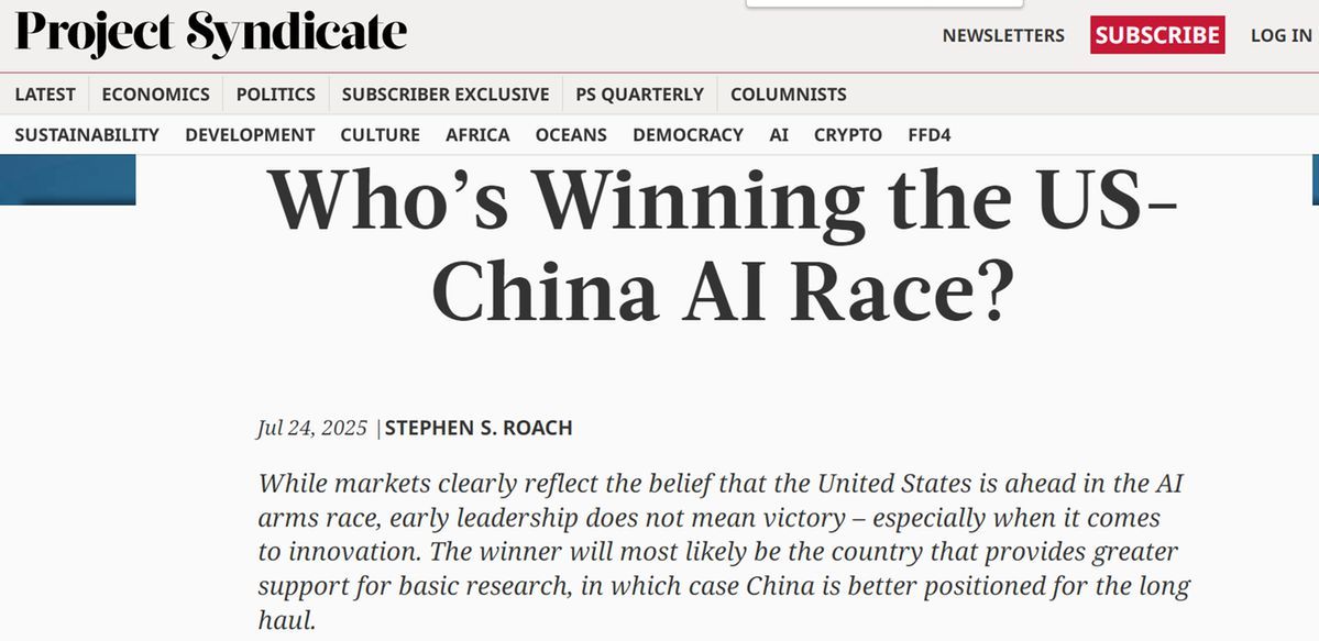 中國(guó)日?qǐng)?bào)網(wǎng)7月30日電 美國(guó)摩根士丹利亞洲區(qū)前主席斯蒂芬·羅奇在報(bào)業(yè)辛迪加網(wǎng)站(Project Syndicate)發(fā)表文章指出,全球人工智能(AI)競(jìng)賽的勝負(fù)取決于基礎(chǔ)研究的投入,而非短期市場(chǎng)表現(xiàn)。羅奇認(rèn)為,中國(guó)憑借產(chǎn)業(yè)生態(tài)、研發(fā)投入和文化傳統(tǒng),使其在長(zhǎng)期競(jìng)爭(zhēng)中占據(jù)優(yōu)勢(shì)。