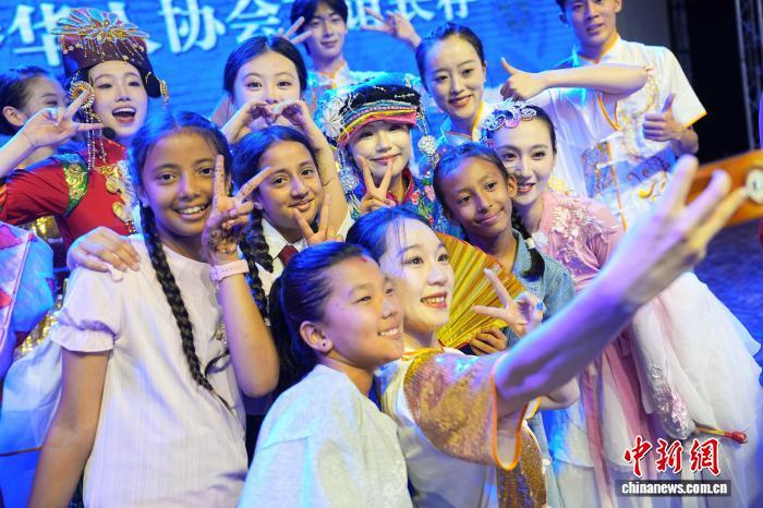 8月3日,尼泊爾加德滿(mǎn)都,中尼建交70周年“多彩中華”文藝演出在尼泊爾軍官俱樂(lè)部上演。多名尼泊爾女孩在演出結(jié)束后,與西南民族大學(xué)石榴籽藝術(shù)團(tuán)的表演者合影留念。中新社記者 崔楠 攝