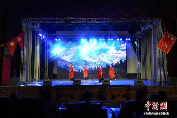 8月3日,尼泊爾加德滿(mǎn)都,中尼建交70周年“多彩中華”文藝演出在尼泊爾軍官俱樂(lè)部上演。圖為來(lái)自西南民族大學(xué)石榴籽藝術(shù)團(tuán)的表演者身著尼泊爾紗麗跳起尼泊爾《抬腳舞》。中新社記者 崔楠 攝