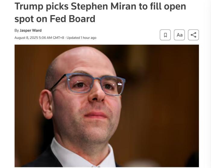 報(bào)道介紹,斯蒂芬·米蘭是現(xiàn)任白宮經(jīng)濟(jì)顧問委員會(huì)主席,擁有哈佛大學(xué)經(jīng)濟(jì)學(xué)專業(yè)的博士學(xué)位,曾在特朗普第一任總統(tǒng)任期內(nèi)擔(dān)任美國財(cái)政部經(jīng)濟(jì)政策高級(jí)顧問。