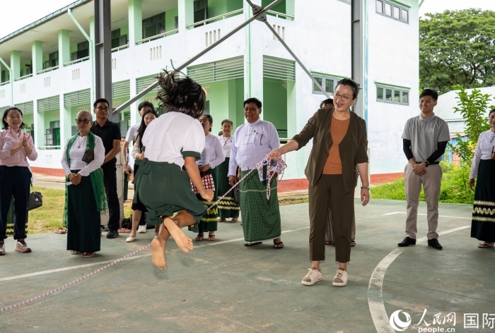 馬珈與內(nèi)比都第14中學學生互動。人民網(wǎng)記者 謝佳君攝