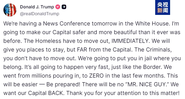 當(dāng)?shù)貢r(shí)間8月10日,美國總統(tǒng)特朗普在其社交媒體“真實(shí)社交”上發(fā)文表示,將于次日在白宮舉行記者會,宣布一系列旨在讓首都“比以往更安全、更美麗”的措施。