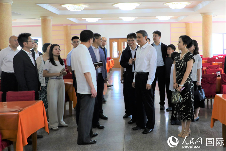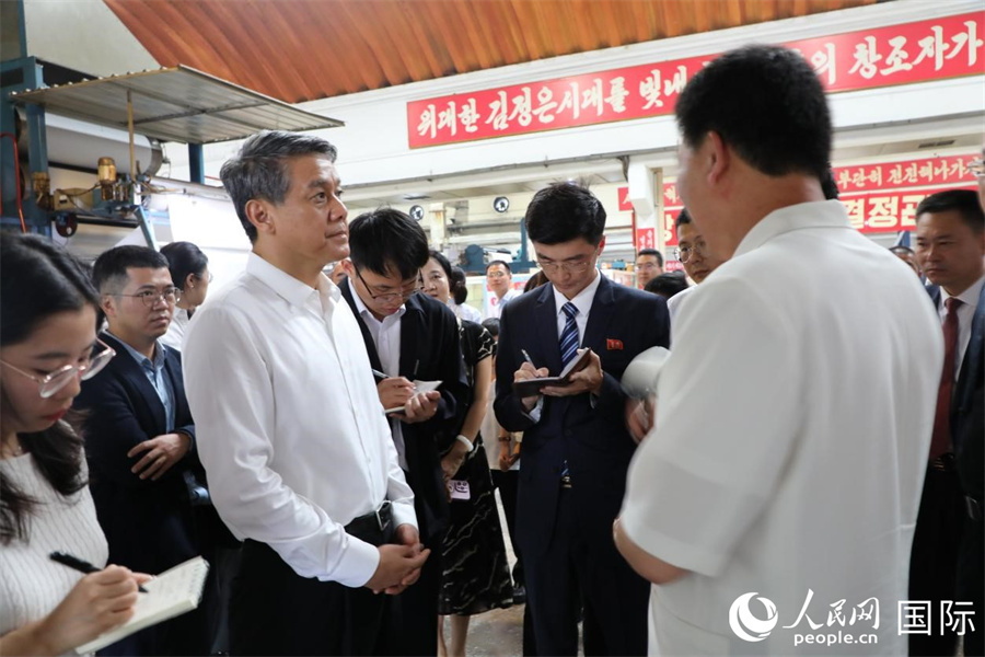當(dāng)?shù)貢r(shí)間8月13日,中國(guó)駐朝鮮大使王亞軍率使館外交官等參觀平壤金正淑紡織廠。圖為李勇根介紹工廠歷史沿革、生產(chǎn)能力、發(fā)展理念等情況。人民網(wǎng)記者 劉融攝