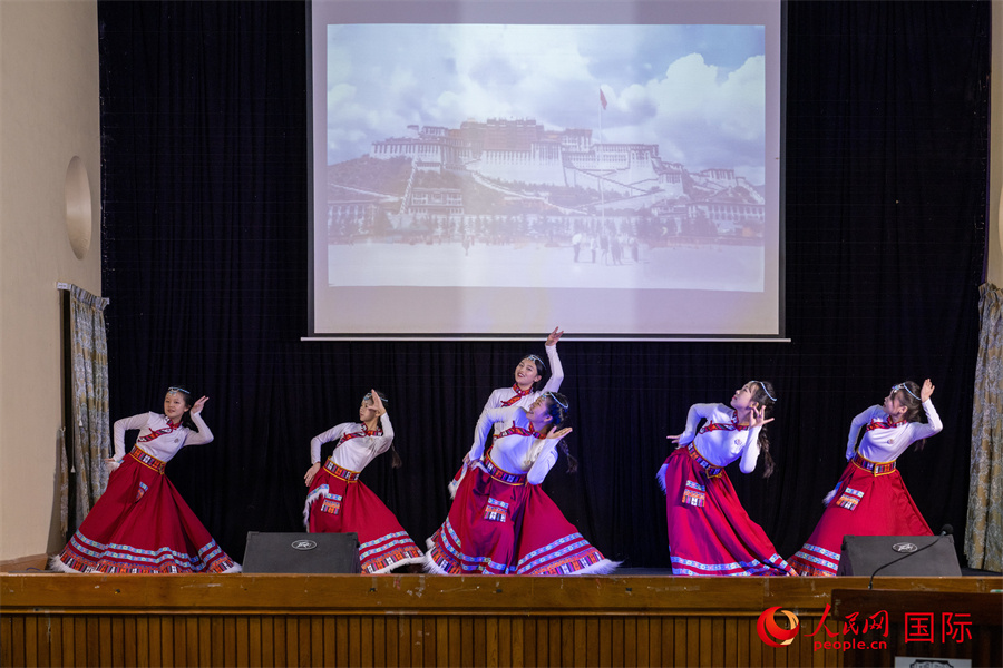 當(dāng)?shù)貙W(xué)生在中緬文化交流會上表演藏族舞蹈。人民網(wǎng)記者 謝佳君攝