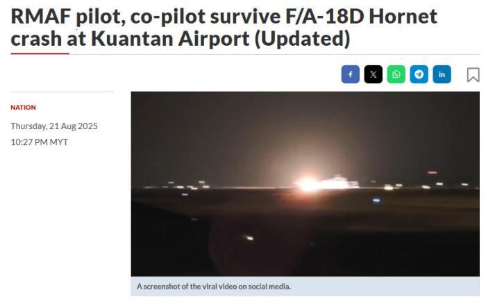 中新網(wǎng)8月22日電 綜合馬來西亞《星報》等媒體報道,當?shù)貢r間21日晚間,馬來西亞空軍的一架F/A-18D“大黃蜂”戰(zhàn)斗機在該國關丹空軍基地發(fā)生事故墜毀。