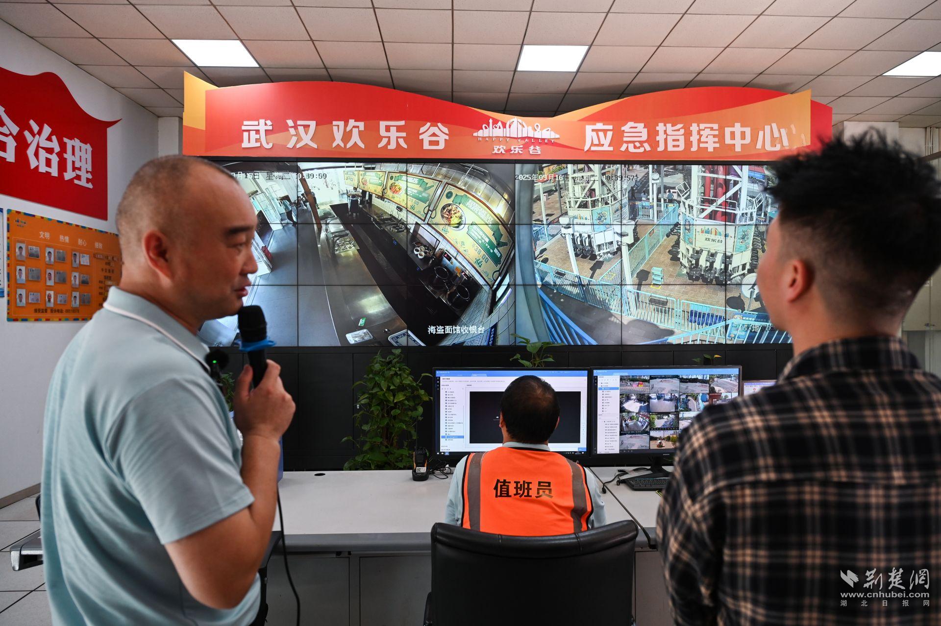在武漢歡樂谷指揮中心,市民代表們目睹了數(shù)十個(gè)電子屏整齊排列,嚴(yán)密監(jiān)控著園區(qū)內(nèi)的各個(gè)角落。在這里,值班人員通過監(jiān)控設(shè)備的實(shí)時(shí)畫面,細(xì)致查看設(shè)備每日早檢及安全運(yùn)營狀況,園區(qū)餐廳也借助智慧監(jiān)管平臺(tái)實(shí)現(xiàn)了透明化管理。
