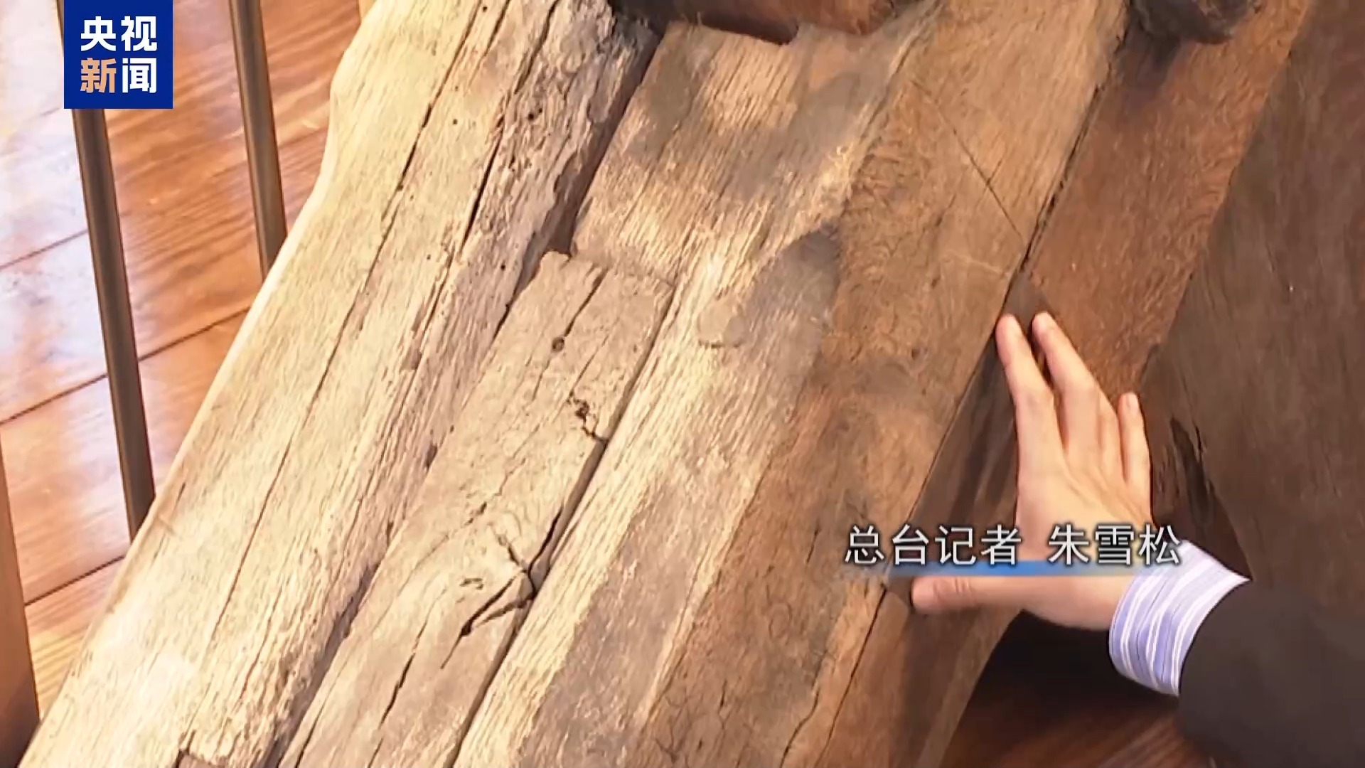總臺(tái)記者 朱雪松:在參觀過(guò)程中,一些細(xì)節(jié)也給我留下深刻的印象。比如我旁邊的這條木梁其實(shí)是非常古舊的。修復(fù)過(guò)程中,工匠在上面做一些記號(hào),同時(shí)用新的木結(jié)構(gòu)來(lái)代替一些破損的地方,可見(jiàn)修復(fù)過(guò)程采用了“修舊如舊”的原則。