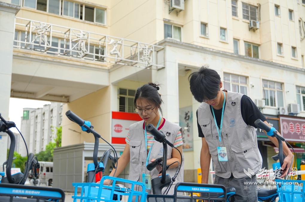 武漢輕工大學(xué)學(xué)生志愿者參與單車擺放。