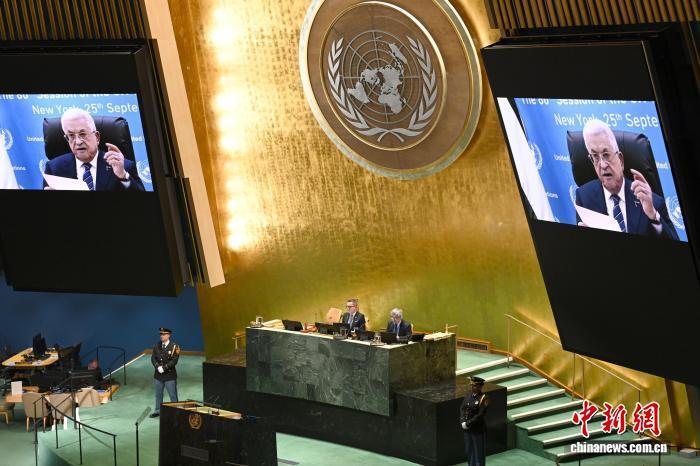 當?shù)貢r間9月25日,紐約聯(lián)合國總部,巴勒斯坦總統(tǒng)阿巴斯以視頻形式在第80屆聯(lián)合國大會一般性辯論中發(fā)言?!≈行律缬浾?陳孟統(tǒng) 攝