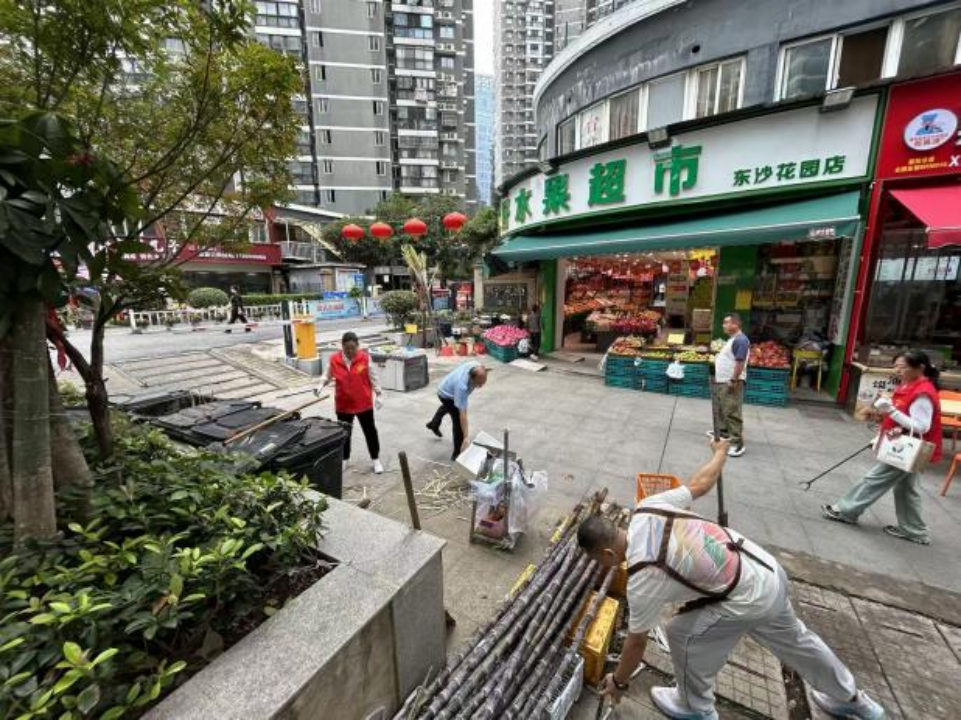 上午九點,東沙商業(yè)街區(qū)一派熱火朝天的勞動景象。行動中,各方分工明確、協(xié)同發(fā)力,形成“多元共治”的生動畫面。街道公管辦與綜合執(zhí)法中心統(tǒng)籌指揮,重點清運街角巷尾積存雜物和大件垃圾;社區(qū)工作人員和志愿者深入綠化帶,細致?lián)焓盁燁^、紙屑,全面擦洗公告欄、垃圾箱等“城市家具”,有效解決容器漫溢、綠化帶藏污等問題。多家商戶也紛紛主動加入,拿起掃帚、水桶,清洗門前路面、擦拭櫥窗、規(guī)范物品擺放,從“各掃門前雪”轉變?yōu)椤肮沧o大家園”。