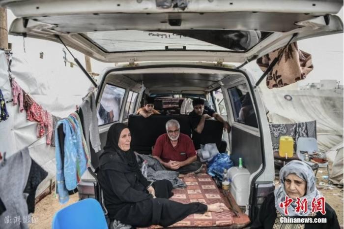 資料圖:加沙汗尤尼斯,巴以沖突持續(xù),當(dāng)?shù)卦庖陨幸u擊后,流離失所的當(dāng)?shù)孛癖娫诶щy條件下艱難求生。因家園被摧毀,他們選擇住在汽車內(nèi)或是搭起的臨時帳篷。