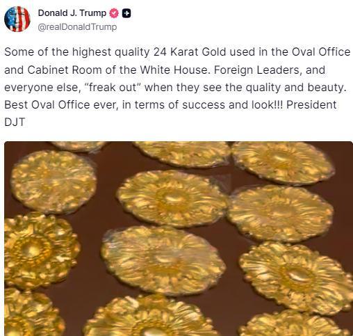 特朗普寫道,“白宮橢圓形辦公室和內(nèi)閣會(huì)議室使用了品質(zhì)最高的24K黃金。外國領(lǐng)導(dǎo)人以及其他人在看到其品質(zhì)與精美程度后都‘驚嘆不已’”。