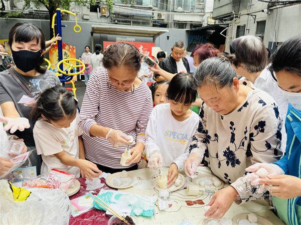 活動現(xiàn)場,各區(qū)域精彩紛呈?!扒墒肿鲈嘛灐弊钍菬狒[,家庭成員圍在桌前,揉面、包餡、壓模默契配合,一個(gè)個(gè)晶瑩的冰皮月餅新鮮出爐;銀杏樹上掛著百余條燈謎,“舉頭望明月(打一中藥名)”“中秋菊盛開(打一成語)”引得居民駐足思索,不時(shí)有人喊出答案,歡呼聲此起彼伏。小朋友們也有專屬樂趣,“月滿花環(huán)”區(qū)里,用仿真花材編出中秋裝飾;“玉兔拔蘿卜”游戲中,你追我趕比拼速度,歡笑聲此起彼伏。