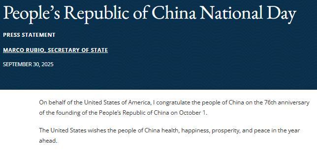 中新網10月1日電 根據美國國務院網站當地時間9月30日消息,美國國務卿魯比奧發(fā)表簡短聲明:我謹代表美利堅合眾國,就中華人民共和國成立76周年表示祝賀。