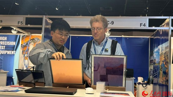 中國企業(yè)鶉火光電工作人員向歐美客戶展示該企業(yè)研發(fā)制造的鈣鈦礦電池。人民網(wǎng)記者 顏歡攝