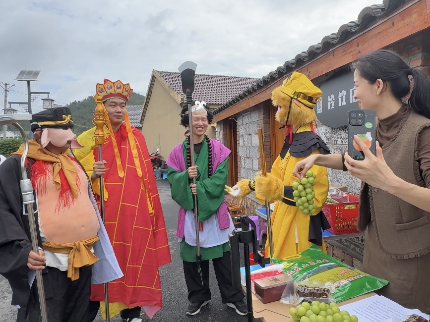 為了增添活動的趣味性和傳播力,鎮(zhèn)黨委、政府特別安排了志愿者扮演唐僧師徒四人,作為推薦官在直播間為大家推薦各類好物,吸引了不少粉絲進到直播間。隨后,還沿著林澗小隱、魚鱗壩巡展,與村民互動,不僅為展銷會增添了歡聲笑語,也讓鄉(xiāng)村振興的理念以更生動的方式深入人心。